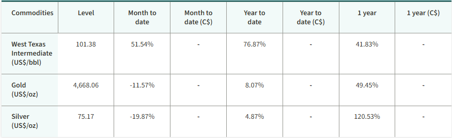 In Canada, the S&P/TSX Composite Index declined, hindered by weakness in the materials sector. U.S. equities also dropped. Yields on 10-year government bonds in Canada and the U.S. increased over the month on higher inflation expectations, which raised the possibility that central banks will be forced to raise interest rates this year. The price of gold declined over March.